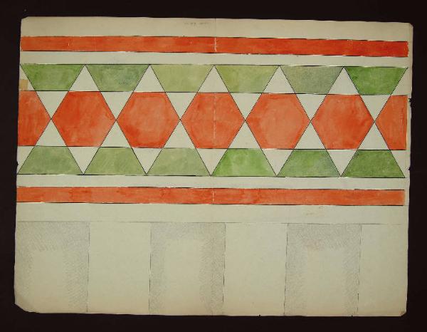 Particolare di fascia decorativa a motivo geometrico verde e rosso. In alto a matita cornice a riquadri.