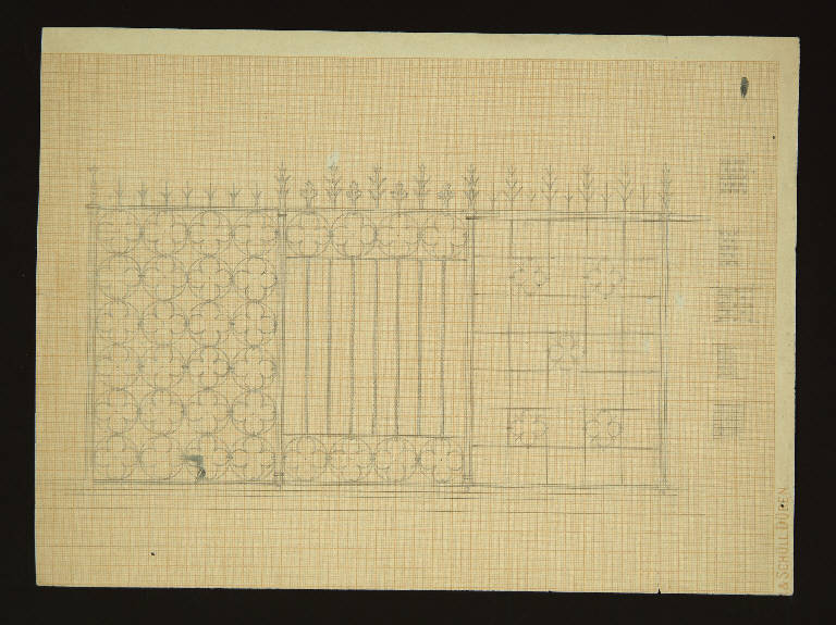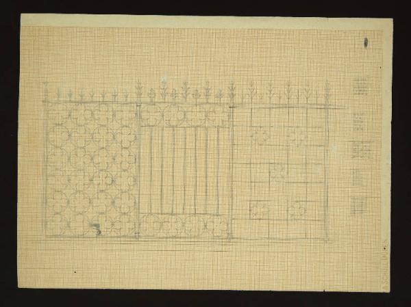 studio decorazione oer cancello con motivi quadrilobati nei cerchi a sinistra e a destra inseriti nei riquadri. Sul margine superiore del cancello elementi decorativi vegetali. Sul lato destro del disegno schizzi di cancello.