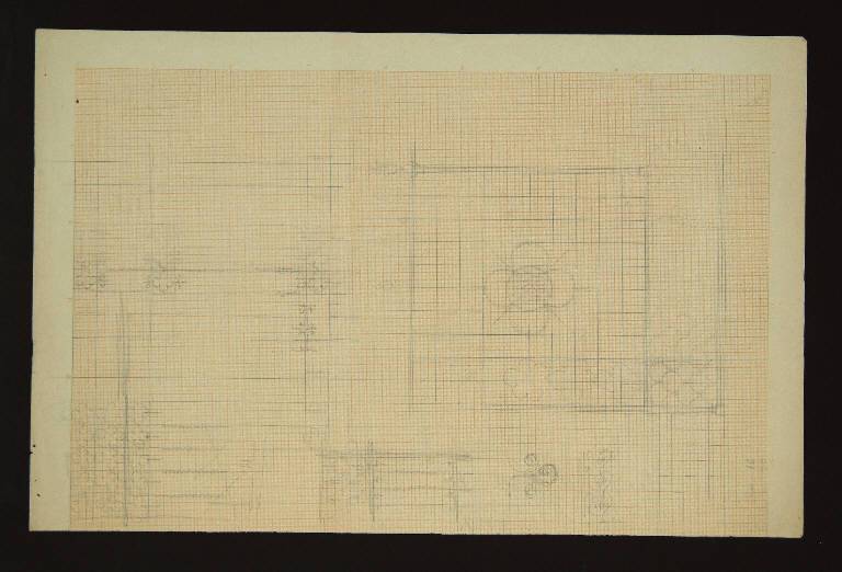 Studio di decorazione per cancelli con particolari dove ricorre il motivo quadrilobato. Indicazioni di misure in basso poco leggibili. Sul verso schizzi di elementi architettonici.