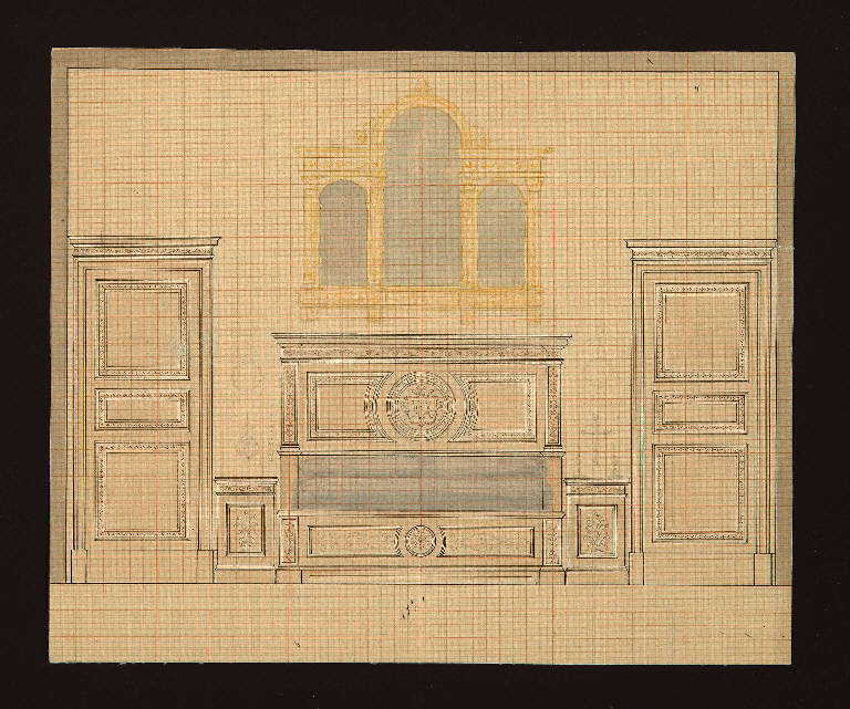 disegno architettonico di arredamento per stanza da letto con porte ai lati , il letto con testata decorata con elemeti floreali in particolare al centro un cerchio con una pergamena che riporta la frase "Felice Notte". Il letto è sormontato da un polittico o finestra trifora. Tracce di disegno precedente al'altezza dei due comodini.