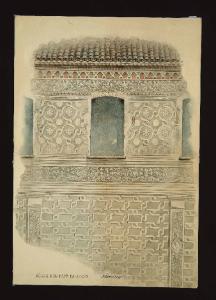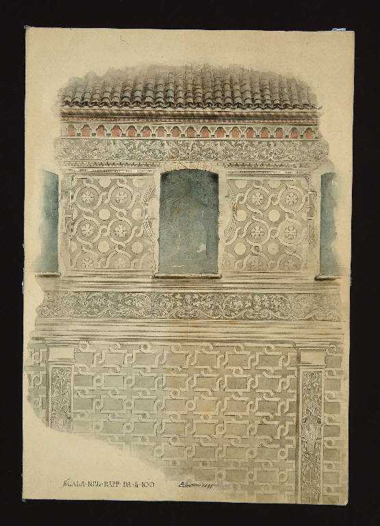montato su supporto a passe-par-tout, tracce della quadrettatura a matita per la strutturazione degli elementi decorativi e dei buchi di compasso per racciare i motivi circolari, acquerello nero, grigio e rosso
