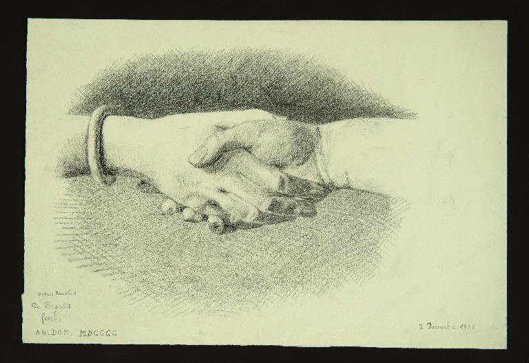 Sul verso disegno con mani intrecciate appena abbozzato