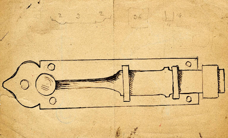 un chiavistello e dei numeri in corrispondenza di alcune parti dell'oggetto\nnel verso: tre schizzi di oggetti riferibili ad una porta