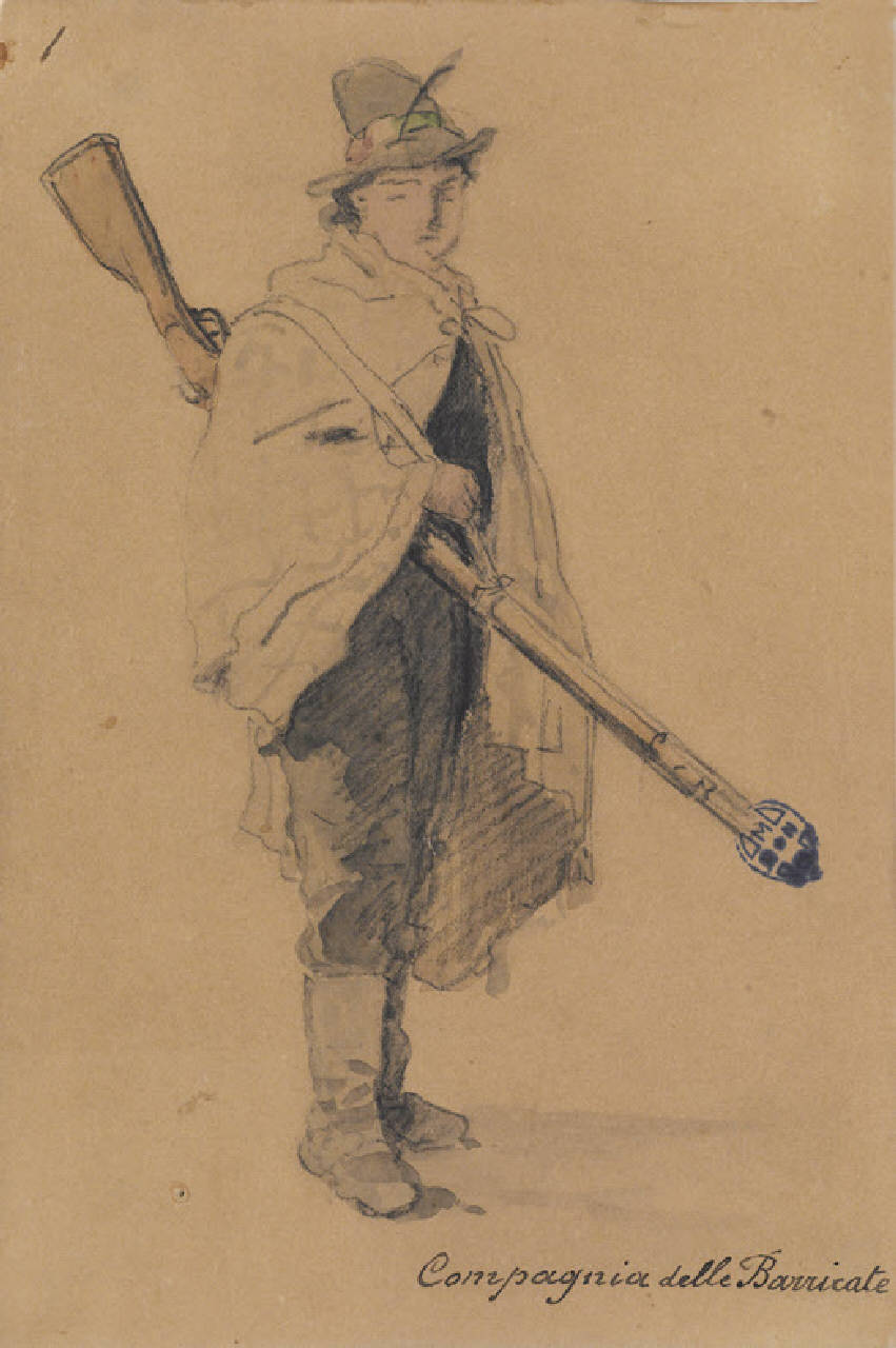 - NOTIZIE STORICO CRITICHE Opera donata dallo stesso autore, registrata come ingresso n. 277, al 12 febbraio 1884, con il titolo "Figurino della Compagnia delle Barricate", tra quelle presentate dalla Commissione milanese all'Esposizione torinese del 1884. Al verso è visibile uno schizzo a matita, cancellato, con figura maschile. Esemplare recante al verso, in alto a destra, il cartiglio, "Esposizione storica di Torino / 1884 / COMMISSIONE MILANESE / Espositore / Induno Gerolamo / Reg. N. 222"; sempre al verso, in basso a sinistra, il cartiglio, "MUSEO DEL RISORGIMENTO / DI MILANO / N.R. 277 / 12.II.1884".