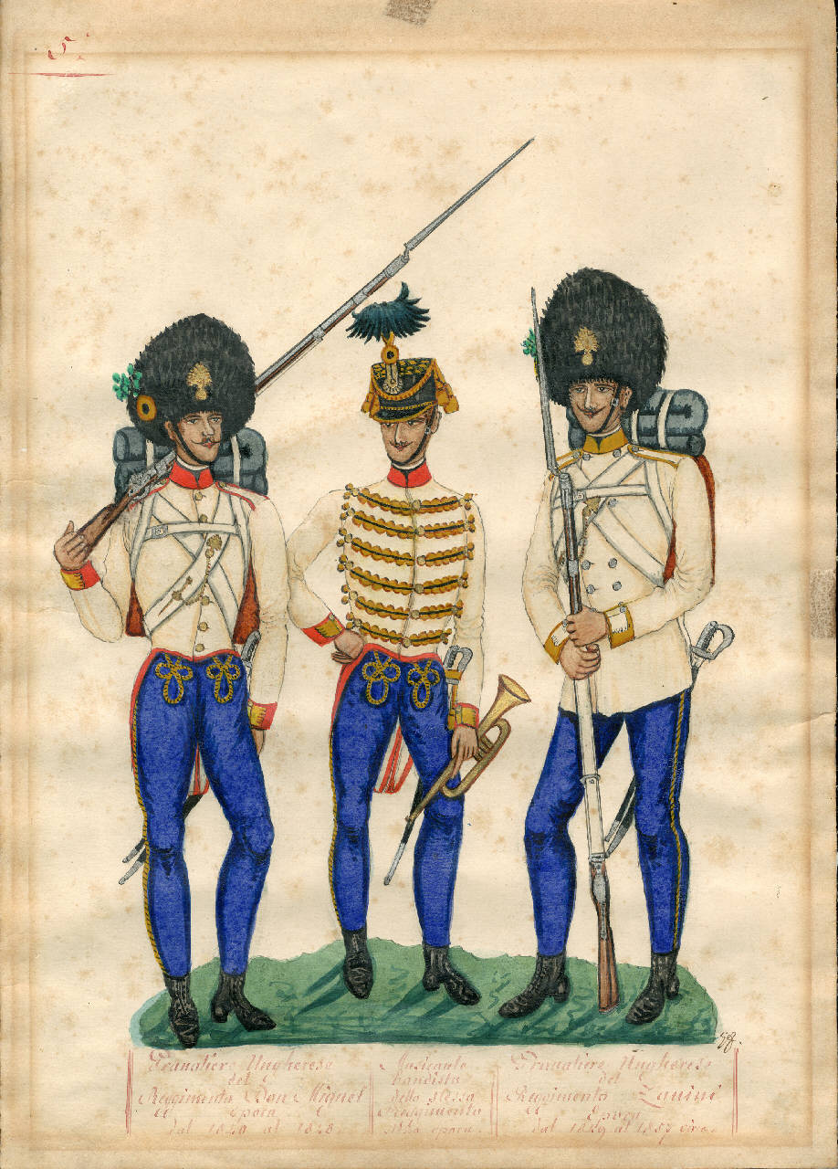 Granatiere Ungherese del Reggimento Don e Miguel. Musicante Bandista dello stesso Reggimento. Granatiere Ungherese del Reggimento Zanini.