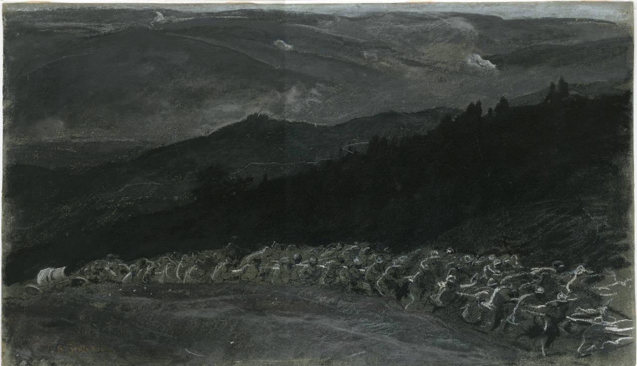 - NOTIZIE STORICO CRITICHE Il foglio è il possibile disegno preparatorio per quadro indicato come disperso intitolato "Traino di un cannone sul Vodice"