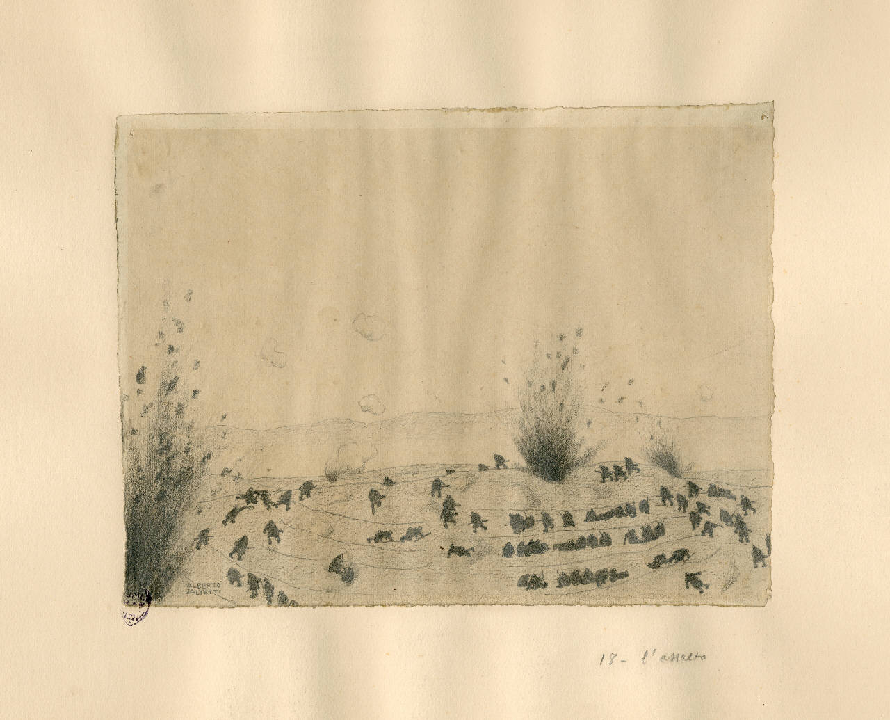 - NOTIZIE STORICO CRITICHE Sisegnala la presenza al verso del cartiglio in basso a destra con numero 38.\nTavola 18 di una serie eseguita sul fronte dall'artista. Il foglio era in origine conservato nella Cartella 35 del Archivio di Storia Contemporanea già Archivio della Guerra.