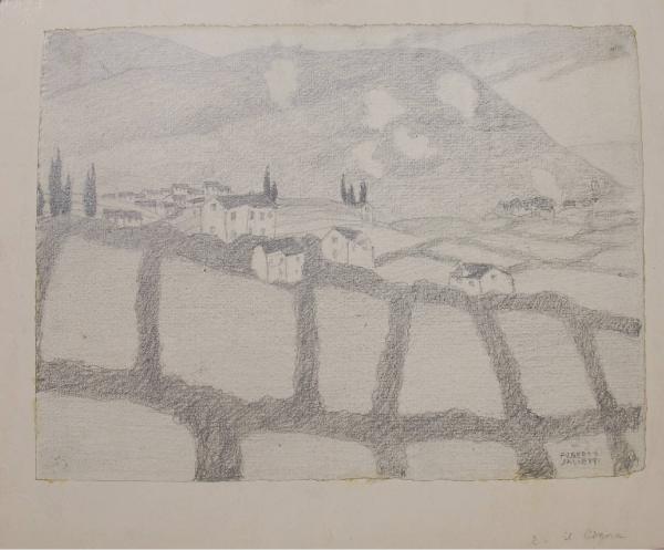 - NOTIZIE STORICO CRITICHE Tavola 2 di una serie eseguita sul fronte dall'artista. Il foglio era in origine conservato nella Cartella 35 del Archivio di Storia Contemporanea già Archivio della Guerra.\nIl Podgora fu teatro di guerra per la prima linea italiana, scenario tragico della battaglia svolta il 19 luglio 1915 come preludio della presa della città di Gorizia, sottoposto a bombardamento con la visione delle case del paese Lucinico.