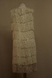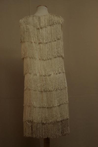 Abito corto di linea diritta senza maniche, in raso avorio ricoperto da ranghi di frange di cotone avorio. Scollo quadrato, breve apertura posteriore con automatiico.