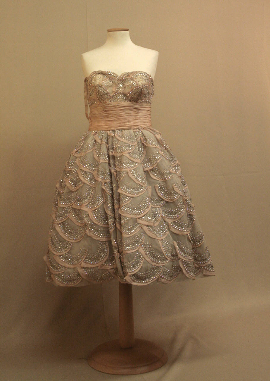 Abito corto a crinolina in tulle avorio ricamato ad embricature definite da piccole gale in crespo rosa chiaro e decorate con paillettes argentate e applicazioni in materiale simil-madreperla. Corpino aderente steccato con scollo totale a cuore, sostenuto da sottili spalline rosa. Vita segnata da alta fascia in crespo a fitte increspature. Apertura posteriore centrale con cerniera, nastro stringivita e fiocco decorativo. Fodera avorio.\nGonna sostenuta da sottogonna in taffetas avorio con 9 balze arricciate di tulle.\nEtichetta all'interno, fianco sinistro.