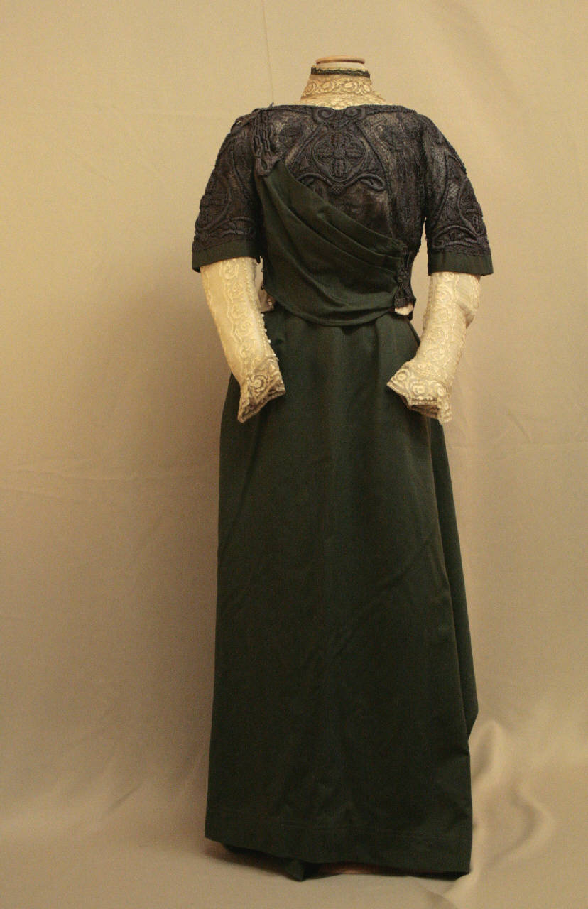 Compelto composto da busto e gonna confezionato in panno verde bottoglia. Busto con alto collo e guimpe in pozzo avorio di seta, doppiato in taffetas, il bordo del colletto è rifinto con un merletto verde lavorato a tombolo; busto in tulle ricamato in seta e con fettuccia in seta, doppiato in tulle; dalla spalla destra, si drappeggia un pannello in panno che abbraccia il fianco sinistro, per seguire su dorso dove si unisce al busto mediante tre ganci;l'abbottonatura è sottolineata da te bottoni non funzionale. Dorso definito dal tulle nero ricamato. Abbottonatura assimetrica sul dorso, dato dal motivo in panno che si apre insieme a parte del dorso in tulle ricamato. Maniche al gomito svasata, in tulle nero, con alto bordo in panno; queste sono sovraposta a maniche più aderenti, in tulle ricaato, doppiato in chiffon bianco, con polso bordato in pizzo; il polso è reso aderente da quattro bottoni in madreperla con asole in filo. Busto foderato in taddetas, con chiusura centrale totale, definito da ventun ganci, modellato con tagli e pinces, su cui sono apllicate le stecche e il nastro stringivita cu cui è il nme della sartoria. Gonna svasata in più teli, decorato con cpassamaneria; chiusura cenrale posteriore mediante ganci