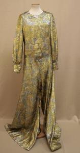 Tuta realizzaa in lame stampato con una fantasia marmorizzata ei toni del grigio e del giallo. Scollo a girocollo, sprone dritto, busto con taglio in vita, a cui sono uniti gli ampissimi pantaloni palazzo. Il busto, nel dorso, presenta la cucitura centrale che accoglie la zip.; manica lnga blusante, con spacco e al polso e polsino chiuso da tre automatici. Fodera in taffetas verde.