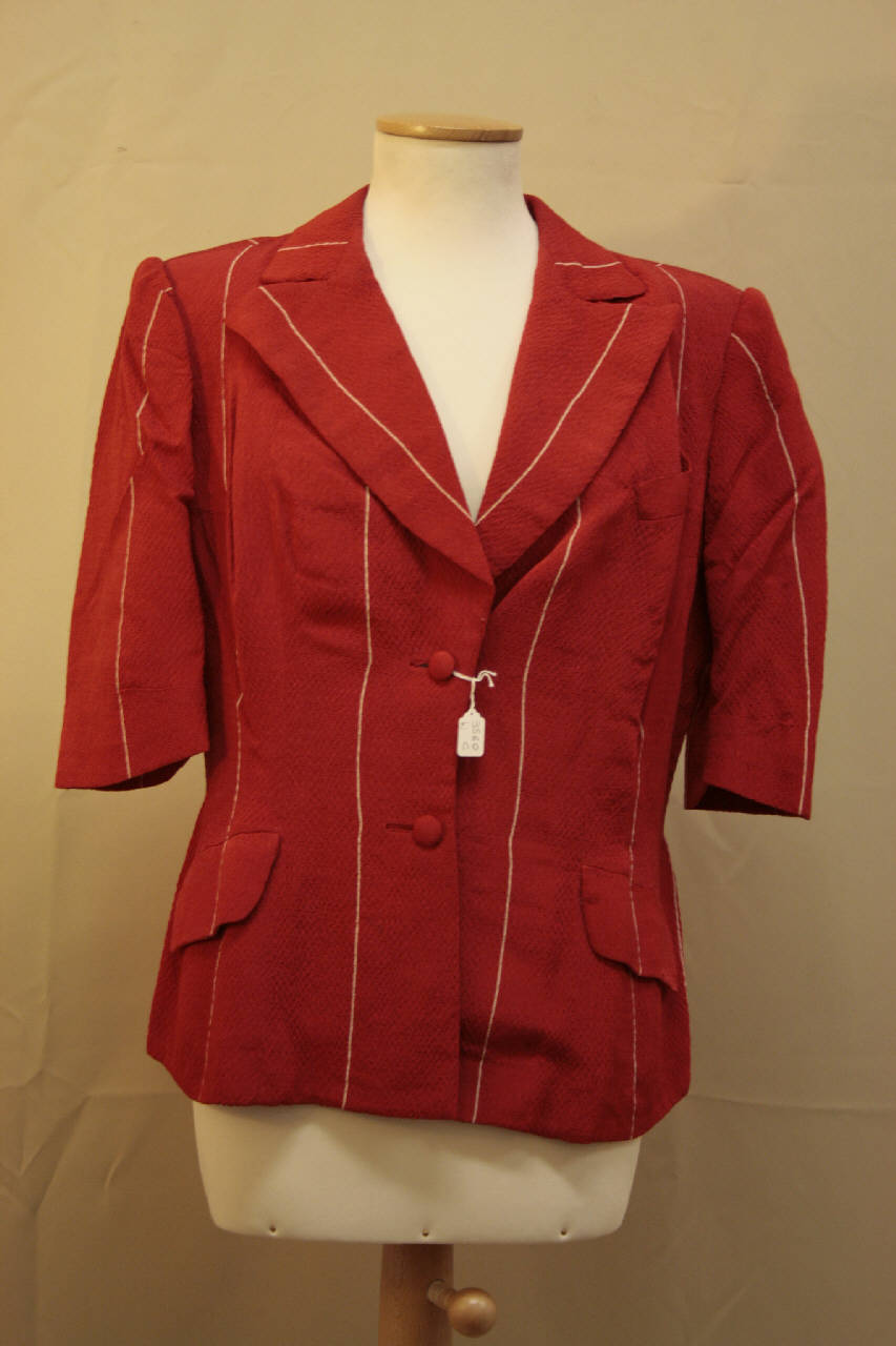 Giacca in crespo stampato: fondo rosso con bande bianche. Corta ai fianchi, ad un petto, modellata da pinces e tagli, tre tasce applicate in sbieco, spalle imbottite e abbottonatura data da due bottoni ed altrettanto occhielli; dorso con sprone dritto, da cui si originano soffietti che terminano in vita, segnata da una cintura, a cui si aggancia la baschina. Maniche corte al gomito in due pezzi. Fodera in taftetas sintetico bianco, su cui è cucita l'etichetta.