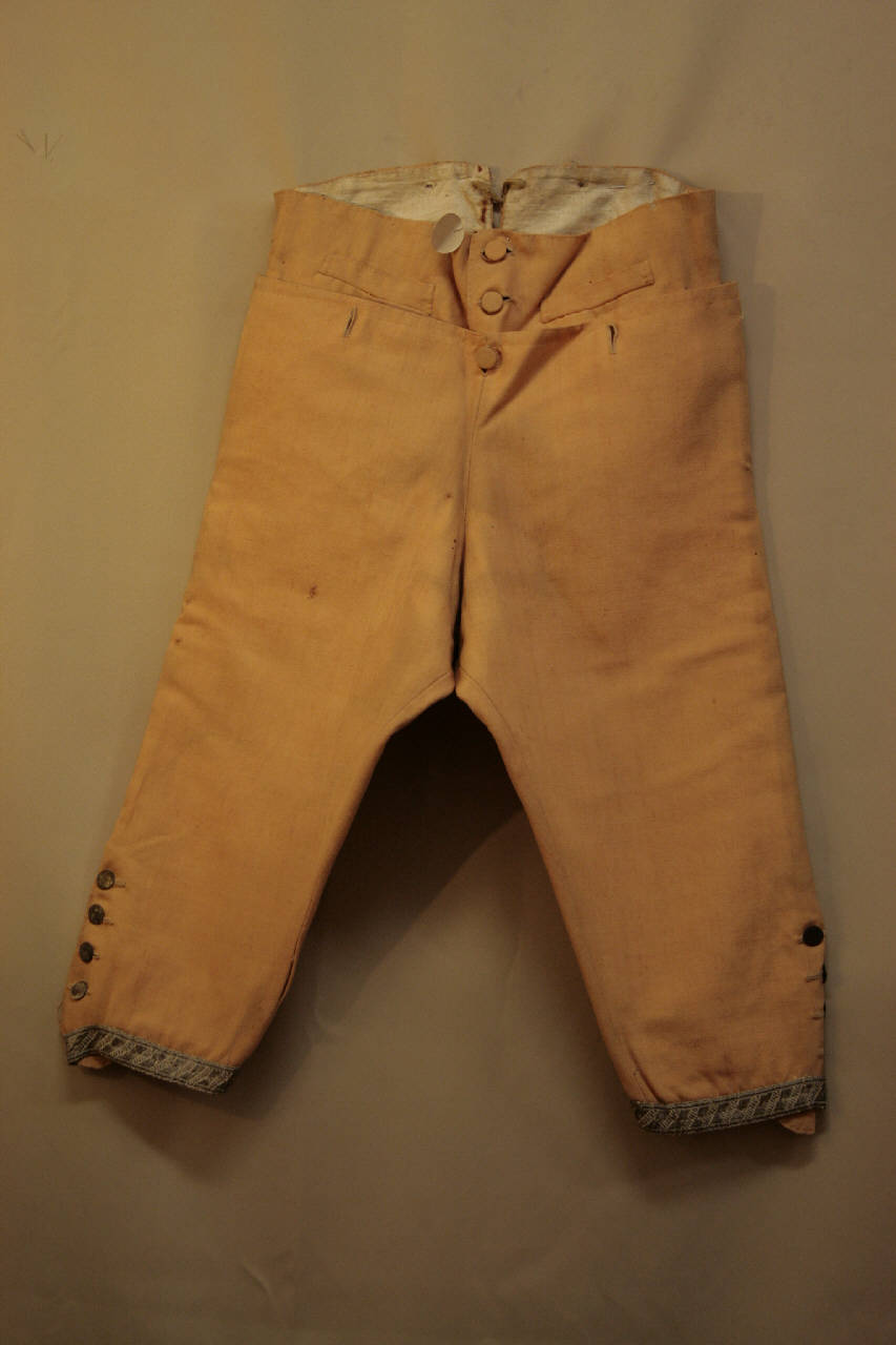 Calzoni in tela di lino albicocca con alta cintura sagomata , patta alla marinara, con apertura centrale anteriore verticale, chiusa da tre bottoni e altrettanto occhielli e coperta da un risvolto di forma quadrangolare abbottonato, mediante occhielli, a cinque bottoni fissati nella zona centrale del cinturino. Sulla cintura due tasche con patta cucita e tasca sagomata inserita nella cucitura ui fianchi. Sul dietro, la cintura presenta uno spacco e quattro occhielli; dalla cintura parte una ricca arricciatura. Ogni calzone è fermato al ginocchio da quattro bottoni in metallo dorato e da un cinturino definito da un gallone in oro filato. Doppiato in tela di lino naturale.