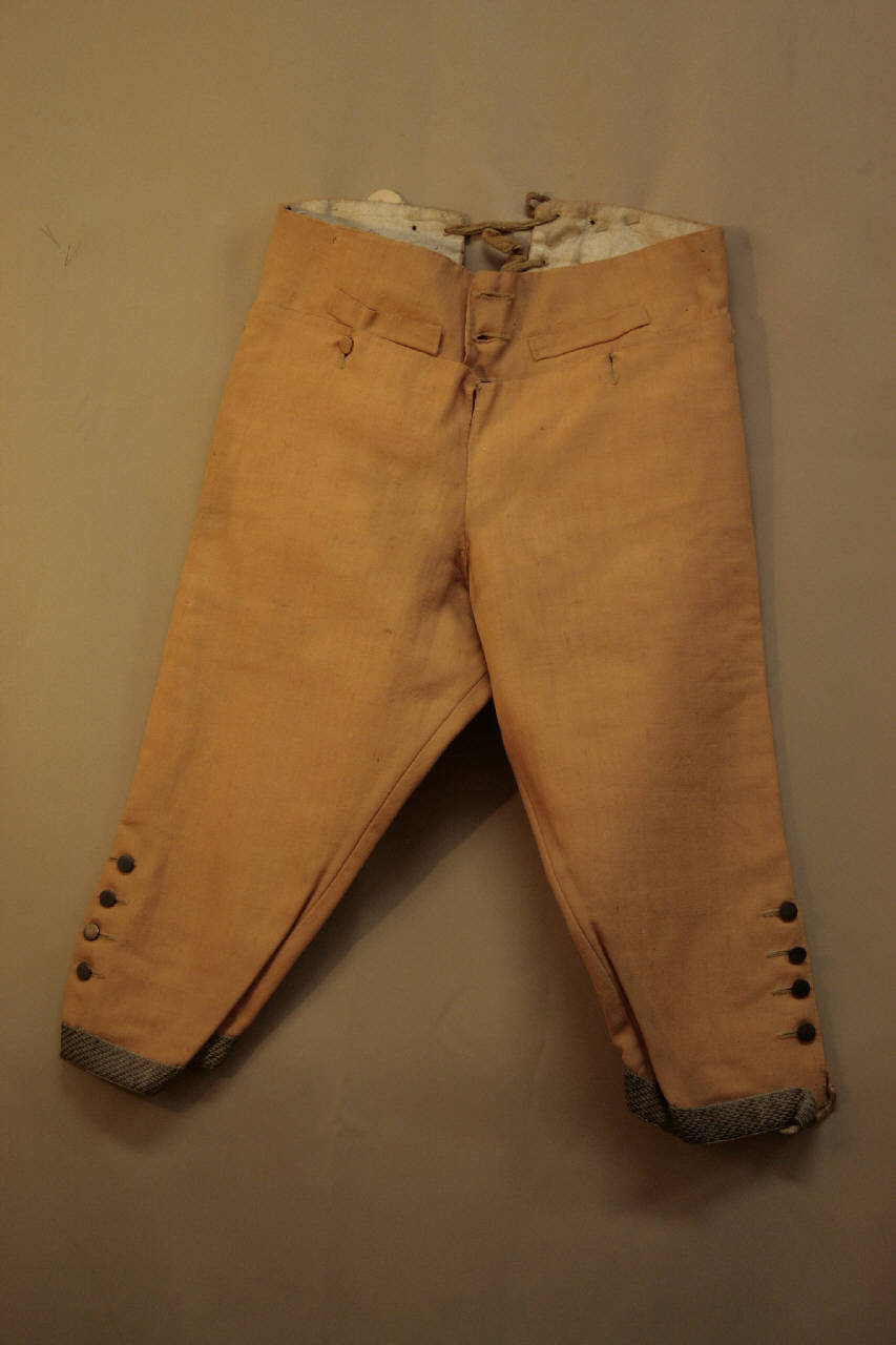 Calzoni in tela di lino albicocca con alta cintura sagomata , patta alla marinara, con apertura centrale anteriore verticale, chiusa da tre bottoni (di cui se ne è conservato solo uno) e altrettanto occhielli e coperta da un risvolto di forma quadrangolare abbottonato, mediante occhielli, a cinque bottoni fissati nella zona centrale del cinturino. Sulla cintura due tasche con patta cucita e tasca sagomata inserita nella cucitura ui fianchi. Sul dietro, la cintura presenta uno spacco e quattro occhielli; dalla cintura parte una ricca arricciatura. Ogni calzone è fermato al ginocchio da quattro bottoni in metallo dorato e da un cinturino definito da un gallone in oro filato. Doppiato in tela di lino naturale.