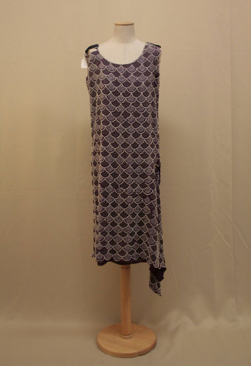 Abito a vita bassa, confezionato in crespo viola, con scollo a barca, senza manica linea scivolata; il dorso presenta l'orlo assimetrico, ad andamento triangolare. Il tessuto è ricamato con perline bianche e perle di vetro trasparente con la tecnica Luneville, formando un motivo ad embricatura.
