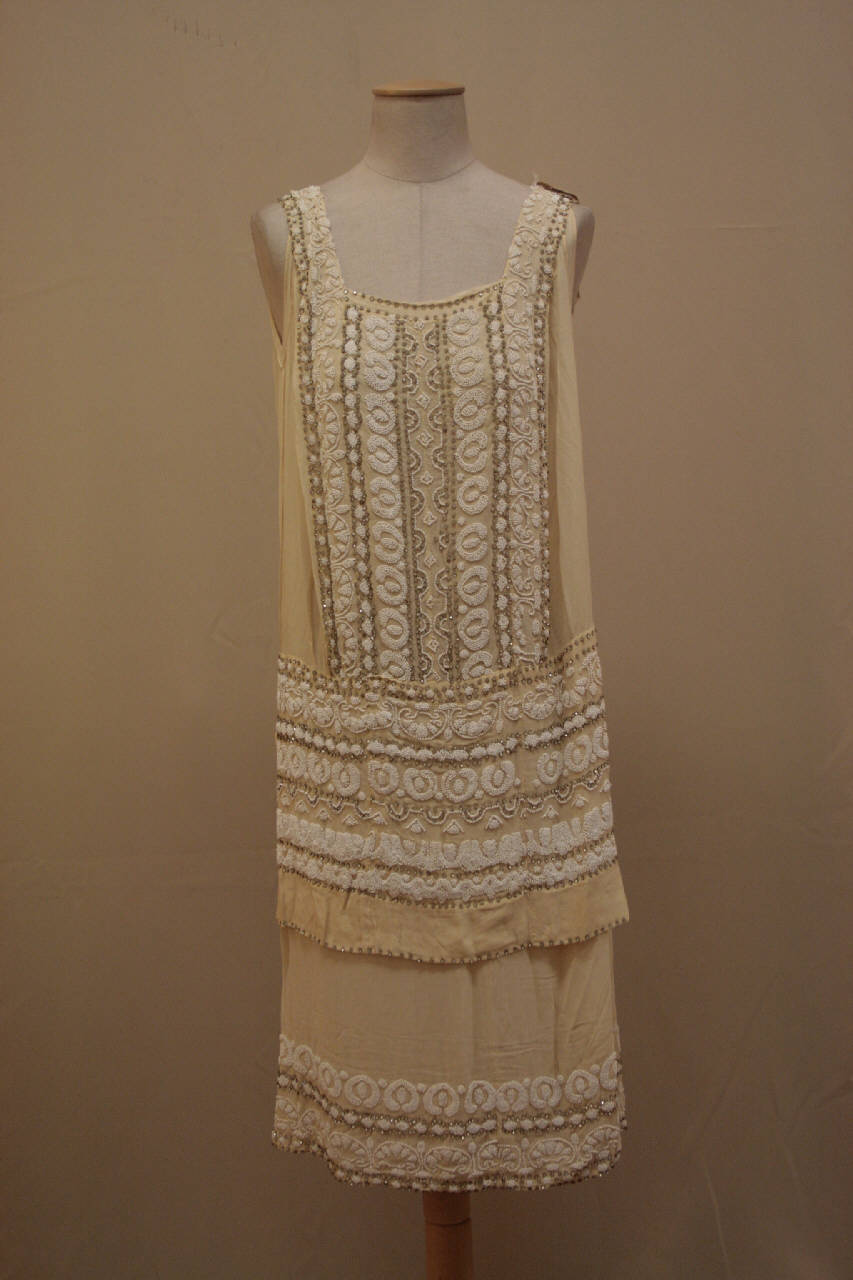 Abito a vita bassa, confezionato in crespo crema, con scollo rettangolare, vita bassa segnato da un taglio e gonna definita da due balze sovrapposte, di lunghezza eterogenea. Il tessuto è ricamato con perline bianche e strass, con òa tecnica Luneville, formando disegni geometrici, disposti verticalmente sul busto e orizzontalmente sulle due balze. Il dorso è uguale al fronte.