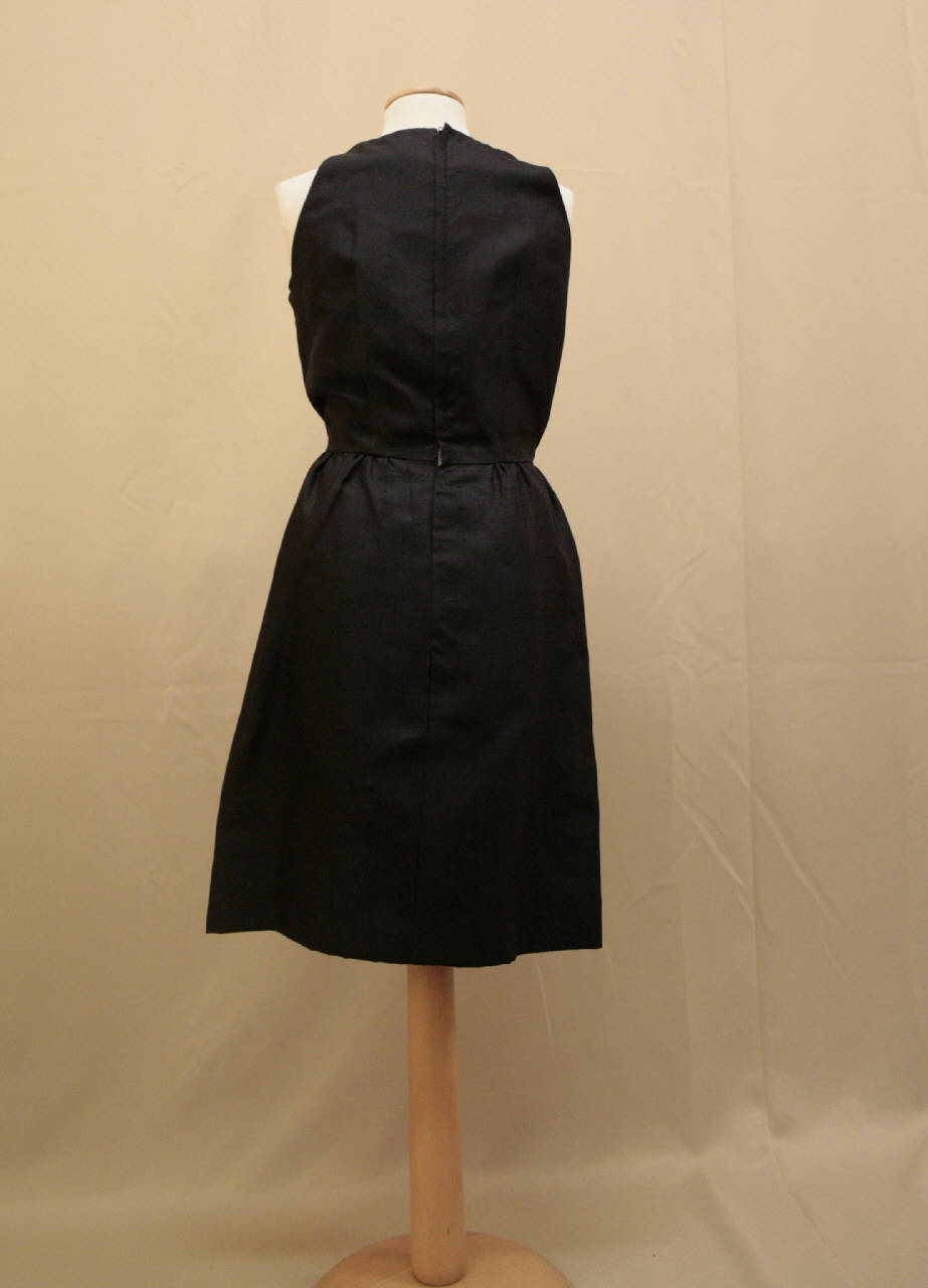 Abito femminile confezionato in daigonale di seta (shantung) nero, contraddistinto da una sperficie irregolare. scollo agirocollo, senza maniche, busto modellato con pinces, taglio in vita a cui è unita la gomma svasata e che riproduce il motivo di una gonna a portafoglio, con il pannelli fermato da tre grandi bottoni non funzionali rivestiti in tessuto. Il dorso è modellato da pinces che si originano dal taglio in vita. Cucitura centrale che accoglie la cerniera. Doppiato in taffetas nero, dove è cucita l'etichetta.