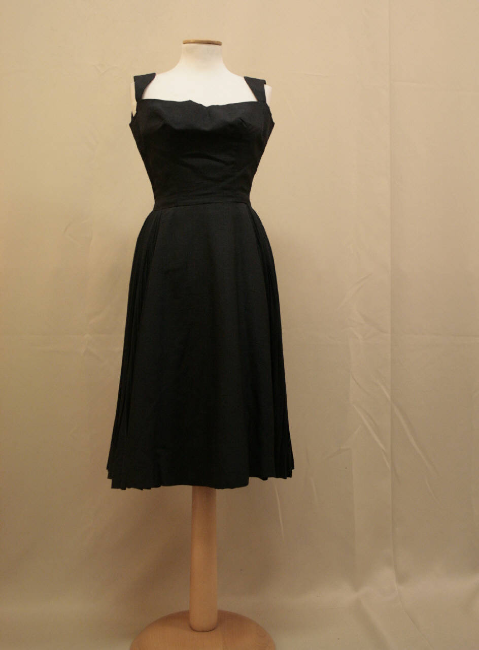 Abito corto al ginocchio, confezionato con una tela misto seta/lana nera. Corpino con scollo rettangolare, modellato da pinces e taglio in vita, elementi che ritornano anche nel dorso, con taglio centrale che accoglie la cerniera. Dal taglio in vita parte la gonna in quattro teli: quelli centrali, lisci, e quelli ai lati plissettat e doppiati in taffetas. All'interno è applicato il nastro stringivita e l'etichetta.