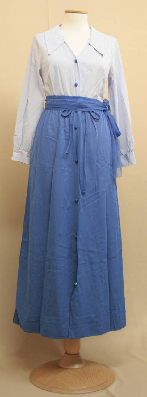 Vestaglia con collo patto su scollo a V, busto tagliato in vita e strutturato da pince all'altezza del sno e da una lieve arricciatura in vita; manica lunga blusante, con polsino. Il busto e le maniche sono realizzate in jersey celeste. Alla vita si unisce la lunga gonna resa morbita dall'arricciatura in vita; tasca inserita nella cucitura del fianco. La gonna è in azzurro. Chiusura data da sette bottoni rivestiti in tessuto e altrettanti occhielli, unitamente ad un auomatico in vita. Cintura in jersey azzurro