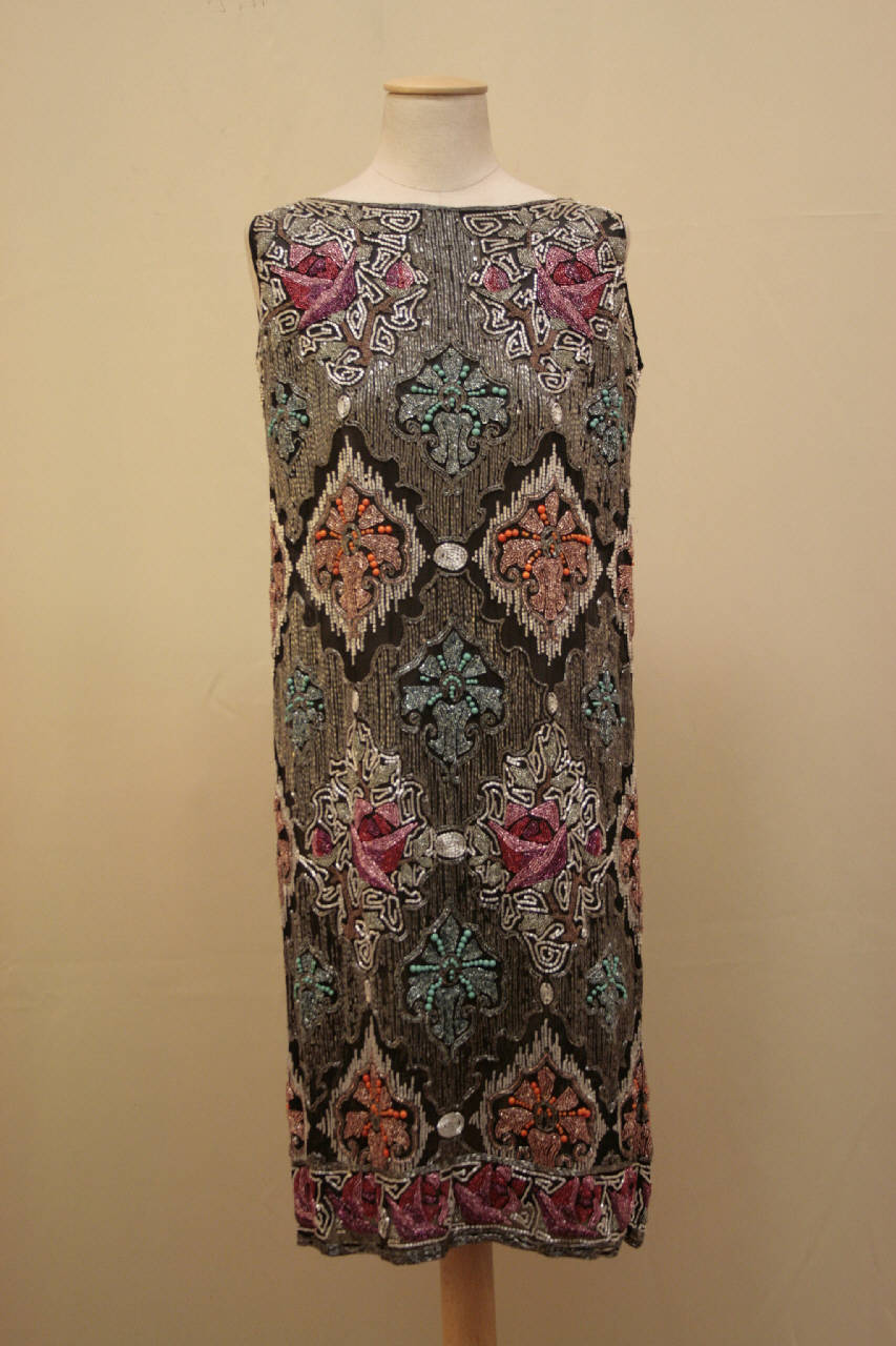 Abito femminile da sera di linea dritta, senza maniche, realizzato in crespo di seta nero, interamente ricamato con perline e cannette in vetro policromo a creare motivi decorativi floreali entro elementi vegetali stilizzati. Scollo rotondo; orlo che termina sopra il ginocchio.