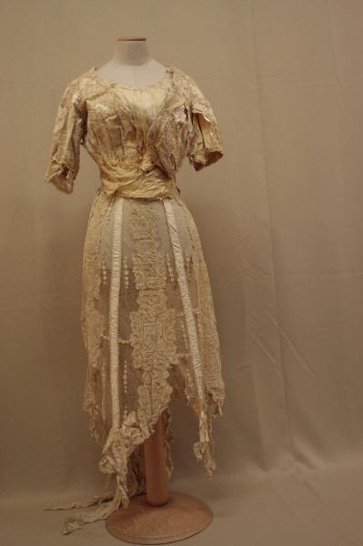 Abito in due pezzi. Blusa con ampio scollo rotondo e decorato con organza drappeggiata, su cui si sovrappone un finto bolero in raso doppiato in tulle ricamato con velluto crema cordoncino di seta applicato su un fondo in organza, definendo motivi a cornici degradanti, lo stesso motivo ritorna anche sul dorso. Vita segnata da una cintura che prosegua anche sul retro in taffettas con nervature. Maniche dritte corte. LA blusa è foderata in tela di cotone, dove son applicate le dieci stecche e un gancio sul retro, al centro. è chiuso mediante ganci metallici. Gonna svasata creata in tulle ricamato con nastri in velluto crema e cordoncino di seta applicato su un fondo in organza, definendo motivi a cornci degradanti mistilinee; cintura in vita in raso avorio