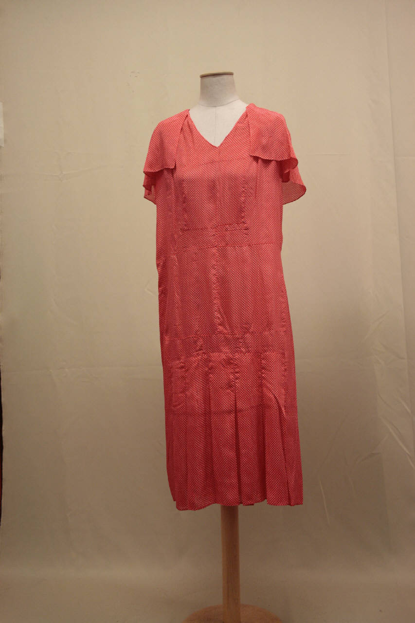 Completo in due pezzi in crespo rosso stampato a piccoli pois bianchi. Abito a sacco longuette, con scollo a V anteriormente e a girocollo, su cui si innesta un collo a bavero, spalle parte una lieve arricciatura, pettorina quadrata sul petto, taglio in vita, baschina sagomata e pannello di pieghe al centro. La stessa ripartizione ritorna anche sul dorso. \nSoprabito più corto a sacco, collo, che sul retro si divide in bande da annodare, con risvolto, modellato da una pinces, tasca applicata decorata da un fiocco, morito che ritorna anche sul polso ella manica dritta; dorso in un pezzo modulato da pinces che partono dal collo. Cintura rettangolare in due pezzi