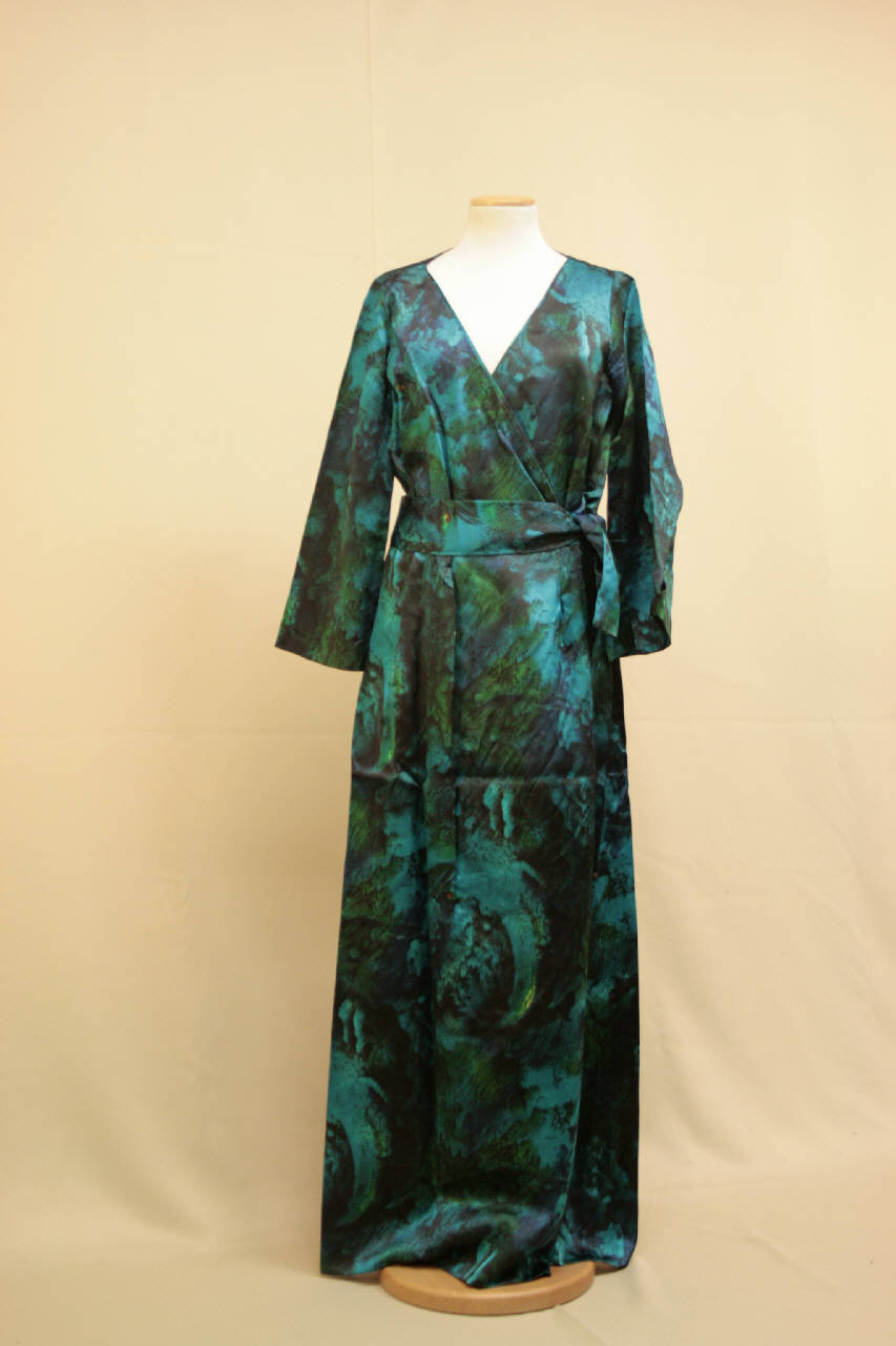 Abito lungo confezionato con raso stampato su fondo verde scuro con effetto scfeziayp. Scollo a V incrociato, chiuso da automatici, che si collega alla gonna, imitando una apertura a portafogio. Sulla scollo è inoltre unita la cintura in tessuto. Taglio in vita da cui parte la lunga gonna.Dorso con cucitua centrale. Manica lunga dritta in un pezzo. Lungo scualle rettangolare, foderato in raso sintetico nero, con i bordi bevi rifiniti da una lunga frangia in filato sintetico nero.