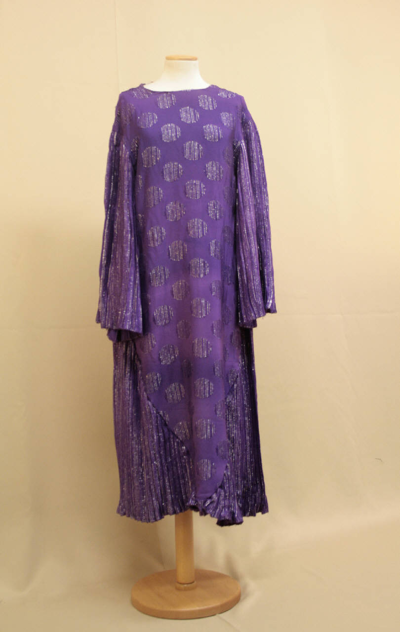Abito a sacco confezionato con taffetas sintetico decorato da pois in oargento lamellare e ciniglia viola ottenuti da orditi supplementari. Scollo a girocollo, orlo sagomato e impreziosito da due pannelli in lamè viola plissettato, impiegato anche per le maniche lunghe svasate. Sul dorso, apertura a goccia all'altezzza dello scollo,