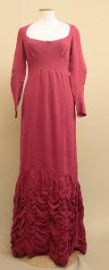 Abito da sera con ampio scollo rotondo, corpino modellato da pinces e lievi drappegi al'altezza del seno, taglio in vita che cotinua nel dorso, co scollo a girocollo, cucitura centrale e pinces. Al taglkio in vita si collega la gonna imprezosita da una balza riccamente drappeggiato. Il drappeggio, sul rovesco, è sostenuto da fettucce di seta. Manica diritta sagomata, con pinces all'altezza dei gomiti e resa aderente al polso da due bottoni rivestiti in tessuto e asole in seta. Chiusura data da una cerniera, posta nella cucitura centrale posteriore. L'abit è in crespo ciclamino.
