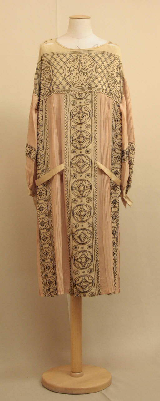 Abito dallalinea a sacco, collo abarca, alto sprone dritto in crepe crema, decorato con un ricqamo a perline nere con la tecnica Lunville, con un motivo di medaglioni con volute fronzute che si stagliano su un fondo a rete. L'abito è quindi strutturato dall'alternanza di tre strisce in crespo crema ricamate (quella centrale con un motivo identico a quello dello sprone, le due laterali da volute fitomorfe e motivi a triangoli) con strisce in crespo rosa pieghettato. Identito il dorso. Dal pannelo centrale partono due cintiure in crespo crema che abbracciano i fianchi per terminare sul dorso. Manica lunga blusante, in crespo rosa, decorata con pieghe piatte e bande in crespo crema ricamato con volute fitomorfe e motivi a triangoli; polso con fiocco, chiuso da un automatico.