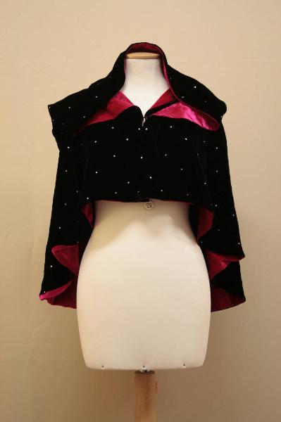 Mantello in velluto nero ricamato con strass disposti a scacchiera e foderata in velluto fucsia. Piccolo pcollo sciallato. sprone arrotondato sul quale si innesta il cappuccio, mantello con orlo degrsdante verso il dorso. Chisura anteriore completa, data da un gancio.