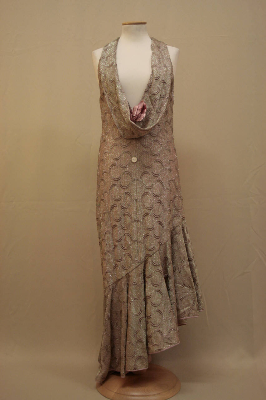 Abito confezionato con tessuto lamè rosa effetto jersey operato, decorato con motivi geometrici curvi. Collo a V molto profonda anteriormentee a girocollo posteriormente, impreziosito da u ncollo ad anello che sul davanti drappeggio, sottolineato da un fiore in tessuto; privo di maniche e modelato dal taglio centrale; orlo assimetrico che regge una gala dall'orlo assimetrico. Chiusura sul dorso, grazie ad una zip inserita nel taglio centrale. Fodera in taffetas rosa, su cui sono cucite due etichette; gala doppiata in organza rosa.