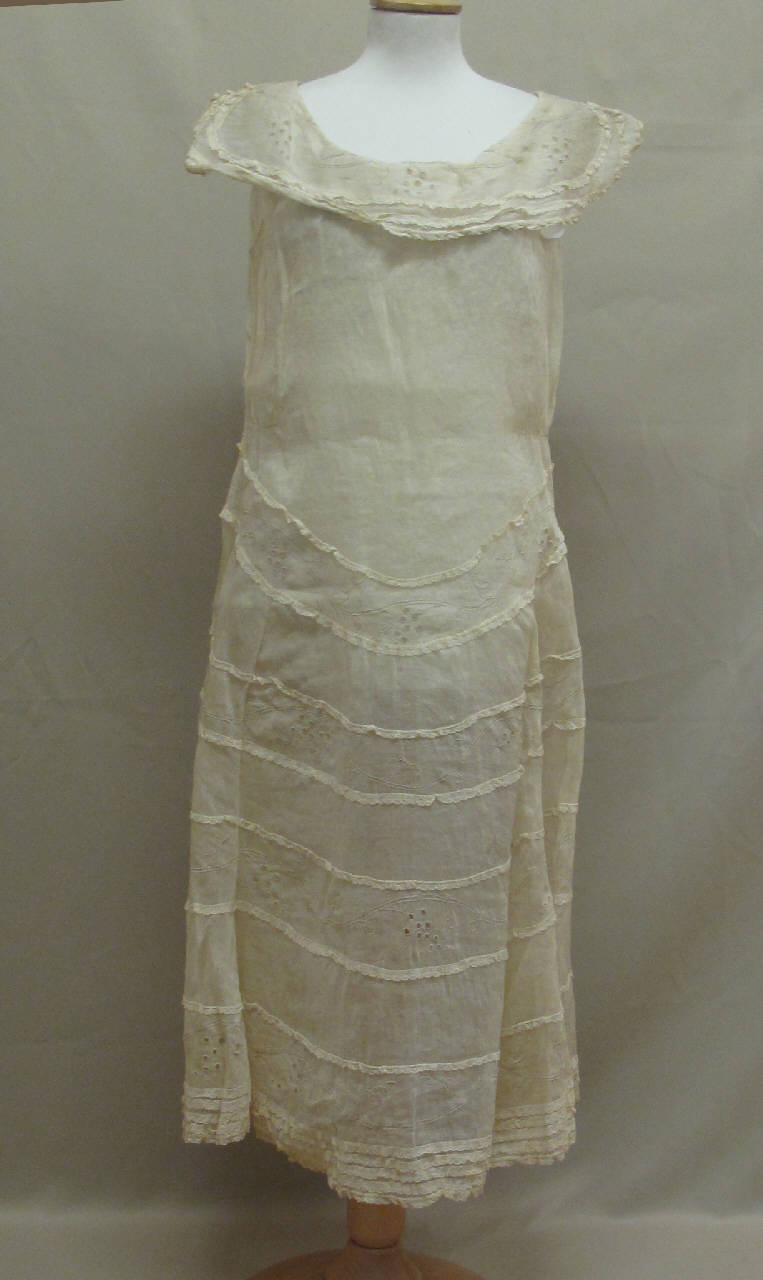 colletto bavero pressochè dritto, decorato da ricamo in seta a soggetto floreale e da merletti in cotone, disposti lungo l'orlo, busto sagomato da pinces al livelo delo seno e piccole pieghe in vita; linea della vita tagliata al livello dei fianchi e sagomata, gonna svasata defiita dalla successione di falsature in organza, sottolineate da natsri in pizzo; lungo l'orlo sono disposti merletti in cinque ranghi.