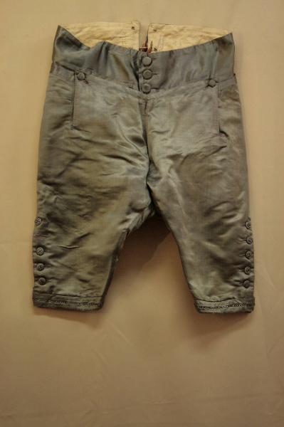 Calzoni in raso celeste. Alta cintura sagomata con due tasca a patta cucita, patta alla marinara, con apertura centrale anteriore verticale, chiusa da quattro bottoni e altrwttanti occhielli, la patta è abbottonata mediante tre bottoni. Due tasche sagomate inserite nella cucitura sui fianchi e chiuse da bottoni. La cintura prosegue sul dorso, con spacco al centro e cinturino con fibia in metallo ; il dorso è contraddistinto da arricciatura. Ogni calzone è fermato al ginocchio da cinque bottoni in tessuto ricamato ricamato con strass, con altrettanti occhelli, e da un cinturino ricamato con strass. Fodera in tela di lino.
