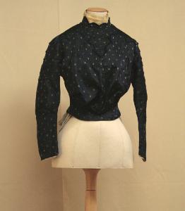 Blusa confezionata in diagonale a pelo strisciante: sul fondo blu si stagliano pois disposti a scacchiera, definiti da orditi supplementari tinti nelle varie tonalità del verde. Colletto ad anello con un motivo di punte, foderato in taffetaa avorio, appoggiato su un colletto più alto in organza avorio e rifinito da un nastro in velluto verde e blu; il colletto è sostenuto da una stecca e chiusa posteriormente da quattro ganci e altrettante asole. Sprone, unito alla fodera, percorso da fitte nervature orizzontali, in parte celato dal corpino con bordo superiore sagomato e rifinito con i nastri in velluto. Dal bordo partono nervature verticali che formano un ricco drapeggio sul petto, per raccogliersi in oto pieghe in vita, leggermente a punta. Dorso modellato da quattro pieghe, con apertura al centro. Maniche dritta sagomata, decorata sulle spalle da pieghe piatte orizzontalie e un alto polso percorso da nervature verticali, rifinito con nastri in velluto e, lungo la linea del polso, contraddistinto da uno spacco, chiuso da due ganci e altrettanto asole, e un bordo in organza. Il capo è doppiato in tela di lino écru, su cui sono applicate dieci stecche, i ganci per chiuderlo e il nastro stringi vita che porta il nome della sartoria.