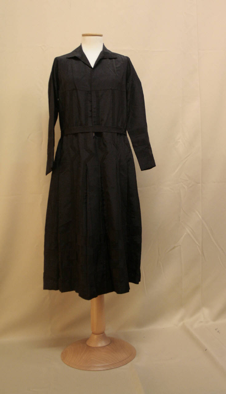Abito femminile in cannettato nero, a vita bassa, collo piatto, apertura parziala anteriore, al centro, allacciata mediante sette automatici, sprone dritto, l'abito è decorato da nastri, tagliati nello stesso tessuto dell'abito crea un motivo a triangolo e che celano pieghe che danno movimento alla gonna, sul rovescio queste pieghe sono trattenuto da una banda in taffetas. L'orlo è sottolineato da bande poste in orizzonati che tornano anche nel dorso, caratterizzato da un doppio taglio vita all'altezza dei fianchi. Due passanti eseguiti a ricami sono state ricamate sui fianchi. Maniche dritte lunghe con il polso decorato da tre bande orizzonatli.
