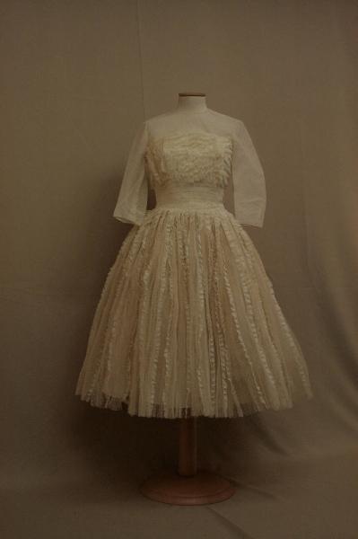 Blusa in tulle operato a piccoli motivi geometrici, con scollo a girocollo, modellato da pinces sia davanti che nel dorso, manica in un pezzo dritta, a tre quarti con pinces al gomito; allacciatura sul dorso con cerniera molto più lunga della blusa. Abito con scollo totale diritto, col corpino percorso da merletti di cotone, applicati su tulle, disposti verticalmente; gli stessi merletti,disposti orizzontalmete, caratterizzano la vita e si dispongono sulla gonna plissettata, sostenuta da sottogonna in tulle e in taffetas sintetico. Fodera in tela di cotone bianco strutturato con tagli e pinces e steccato con cinque stecche. Chiusura con cernieraposta sulla cucitura centrale posteriore. Con il tulle è stato confezionato anche il velo, con piccola acconciatura di finti fiori di mughetto; coccarda in nastri di raso per bouquet.