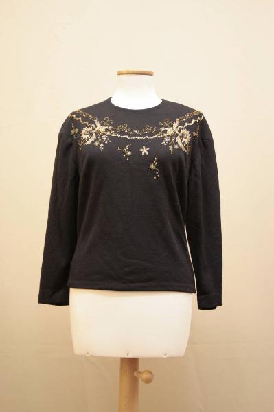 maglia lunga fino alla vita, von maniche lunghe aderenti, modellato anteriormente da due pinces al seno, chiesa sul retro da una zip posta al centro. Sul petto e sulla schiena è un ricamo MOTIVI VEGETALI