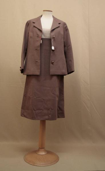 Completo costituito da abito e giacca confezionato in panno di lana nocciola e rosa cipria e fodera in taffetas sintetico in tono. Giacca monopetto chiusa da tre bottoni, collo con risvolti a punte dritte, maniche in due pezzi, con due bottoni all'altezza del polso.La giacca è modellata da tagli e fianchetti ed è confezionata in lana nocciola. Abito senza maniche, con corpino con scollo quadrato anteriormente e motivo di cucitura a greca. Il corpino è in panno rosa, mentre la gonna al ginocchio e svasata è confezionaat in panno nocciola. Il retro presenta il corpino, sino al punto vita, ros e la gonna nocciola. Al centro è applicata una lunga cerniera. Pinces modellano il capo sia anteriormente che posteriormente