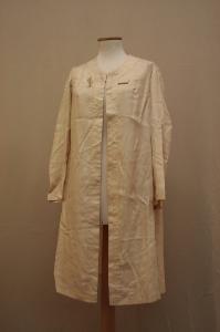 soprabito dalla linea dritta, con lo scollo e l'apertura anteriore sottolineati da un alto bordo. sullo scoollo sono due occhielli e subito al di sotto dello scollo sono due grandi asole ottenute dal medesimo tessuto. Pinces all'altezza del seno. Maniche lunghe in un pezzo.Dorso arricchito da un motivo a triangolo che sottolinea lo scollo. Il capo è confezionato in taffetas effetto shantumg color crema