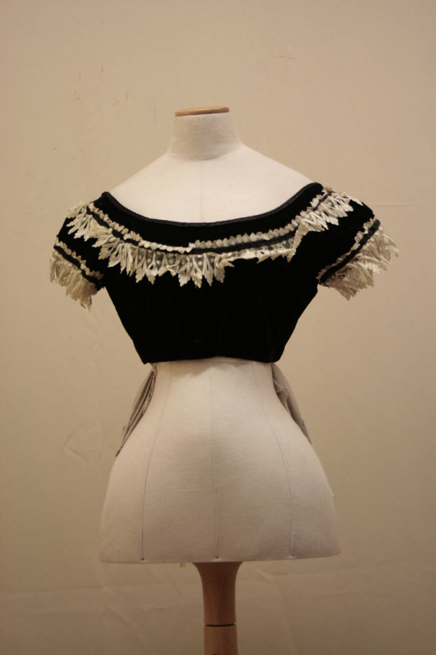 Corpino in velluto nero, con scollo a barca bordato con pizzo ècru decorato da elementi flreali, strutturato da tagli e pinces, sul petto è decorato da una gala di pizzo retta da un nastro di raso nero che borda anche lo scollo, vita dritta, abbottonatura centrale completa, definita da quattro grandi bottoni rivestiti in raso e altrettanti occhielli e da un gancio in vita. Dorso modellato da tagli, decorato dalla gala di pizzo; al centro, quasi all'orlo, è un asola n seta. Maniche corte a palloncino, decorato lungo l'orlo con gala di merletto. Doppiato in raso di cotone nocciola, sette stecche foderate con fettuccia di cotone, impiegato anche come stringivita e pr rifinire la vita.