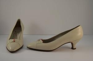 Scarpa con tomaia in pelle bianca, con mascherina sottolineata da una cucitura e motivo a fiocco; cucitura sul tallone. Fodera e soletta in pelle bianca e talone in pelle scamosciata. Suola in cuoio che continua anche sul tacco a coda foderato in pelle bianca. Marchio impresso sulla soletta.