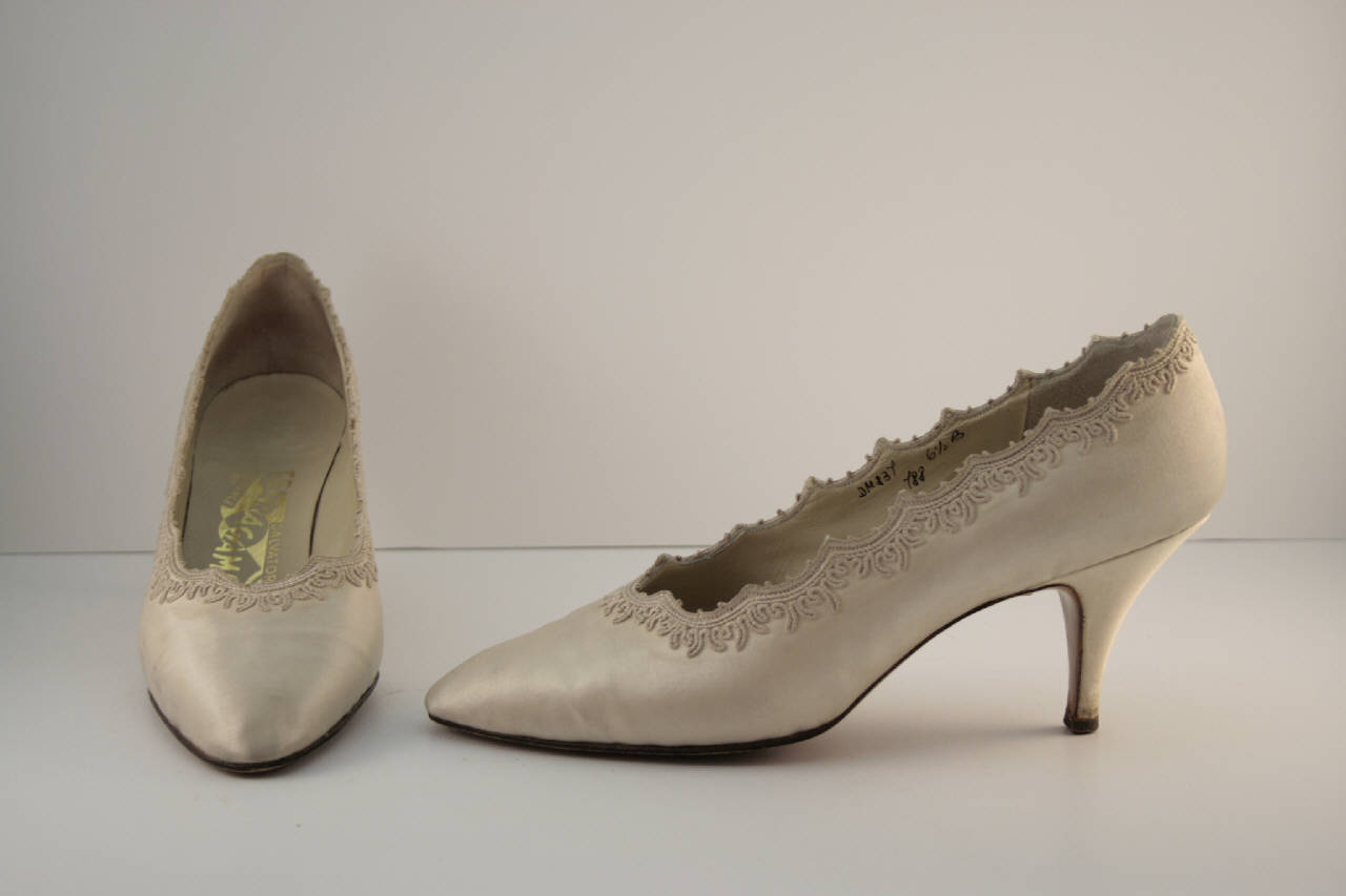 Scarpa con tomaia in raso avorio in due pezzi cuciti posteriormente, bordo sagomato e sottolineato da un ricamo tono su tono in seta; punta a punta. Fodera e suoletta in pelle deige e tallone in pelle scamosciata beige. Suola in cuoio che continua anche sul tacco a spillo, rivestito in raso. Nome impresso sulla soletta.