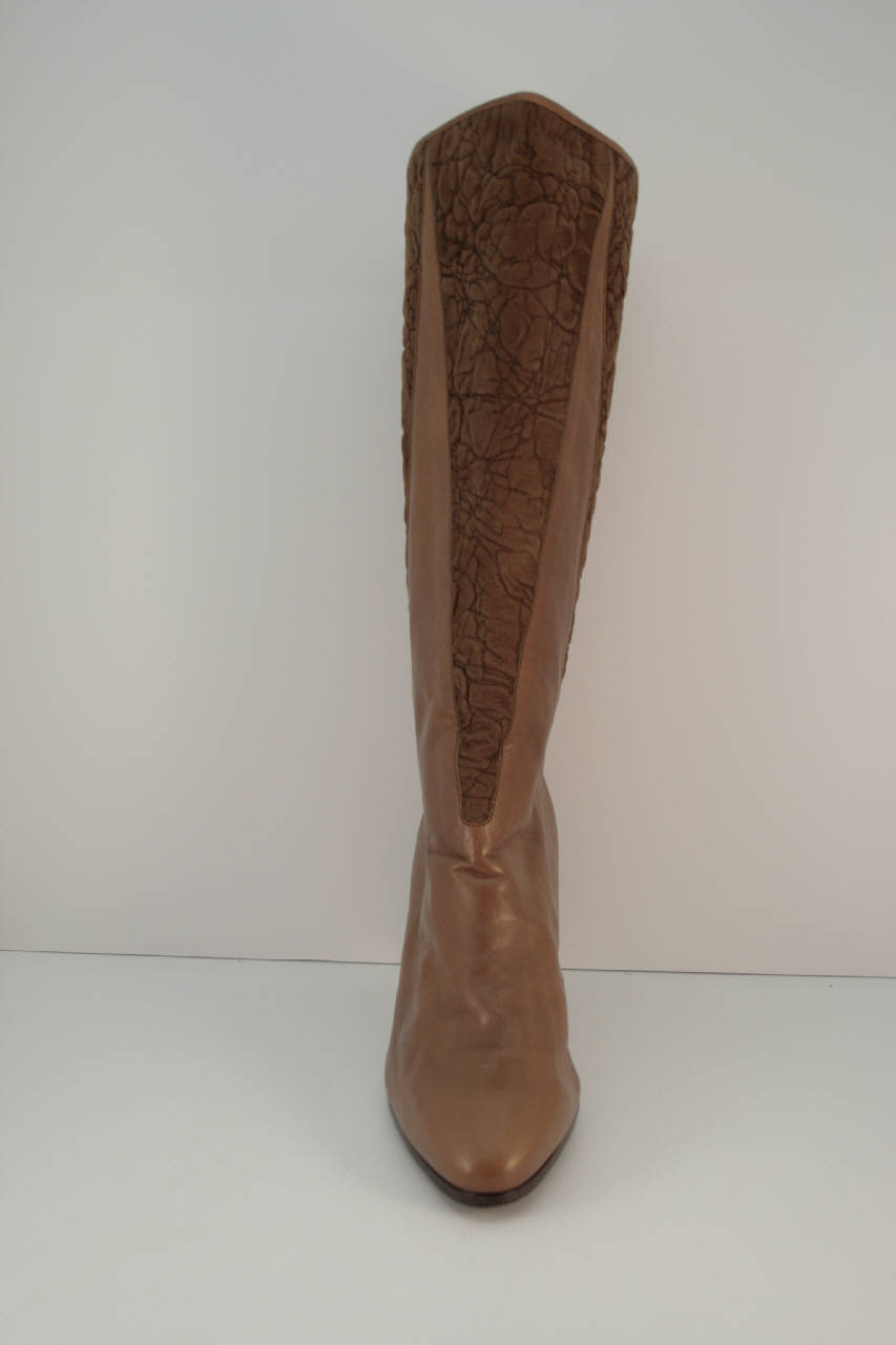 Stivale destro in pelle noccola con punta affuolata e gambale decorato da quattro inserti triangolari in pelle scamosciata. Fodera e suoletta in pelle bianca. Suola in cuio che continua sul tacco a cono imitante un tacco a strati; la suola anteriormente è in gomma nera. Eticheta cucita sulla suoletta
