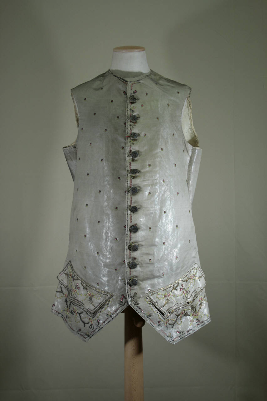 Gilet in telletta d'oro ricamata a piccoli motivi vegetali che si dispongono a scacchiera sul fondo, lungo l'orlo della mostra e delle falde, e a trionfi vegetali sulle tasche; il ricamo è in seta policoma, paillettes dorate e smaltate, canutiglia. Collo a girocollo, mostre dritte dove sono dodici bottoni rivestiti in lamina dorata e ricamati e altrettanti occhielli, tasca con patta sagomata decorata da tre bottoni. Falde sfuggenti verso il dorso con cucitura centrale in diagonale di seta écru. Fodera in raso di seta avorio.
