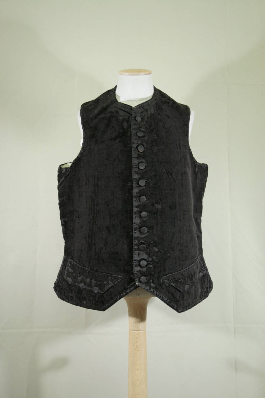 Gilet maschile a un petto, scollo a girocollo e due tasche con patte decorate da tre bottoni rivestiti in tessuto, undici bottoni rivestiti in tessuto e altettanti occhielli. E' confezionato in velluto nero riccio. Fianchetta in tela cerata marrone, doppiata in tela di lino écru. Dorso in due pezzi con spacco cenrale ottenuto cucendo diversi pannelli di panno di lana nero e velluto. Doppiato i diagonale di lana avorio, mentre l'apertura e l'orlo delle falde in diagonale di seta nera.