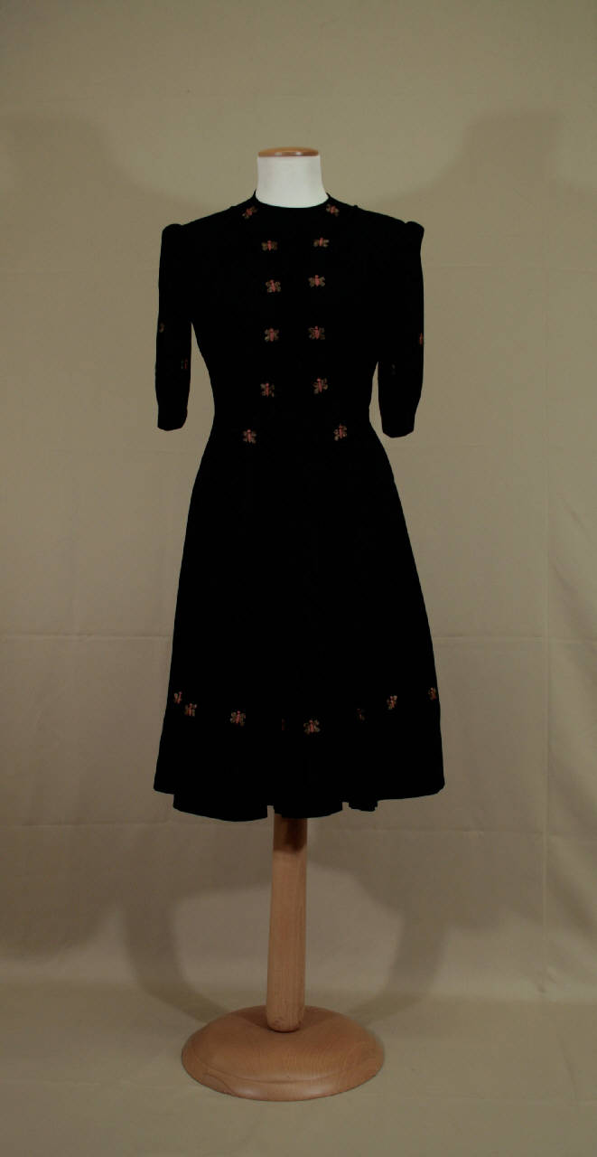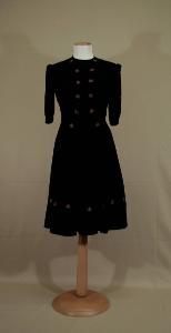 Abito corto al ginocchio confezionato in crespo di lana nero, decorato con farfalle ricamate in seta rosa e oro filato. Busto con tagli ad andamento triangolare sul seno e all'altezza della vita. I tagli del seno sono sottolineati anteriormente da un cordoncino in crespo imbottiti. Scollo a girocollo, maniche al gomito arricciate e con pinces che partono dal bordo del polso; imbottitura in crespo per sostenere l'arricciatura sulla pala. Gonna a due teli svasati, con pannello plissettato anteriormente. Taglio della vita dritto posteriore. Abbottonatura sul retro, al centro, definito da sette bottoni e altrettanti occhielli e da una cerniera all'altezza del fianco sinistro. Le farfalle ricamate sono appli ate sul davanti del busto, sulle maniche, e lungo l'orlo.