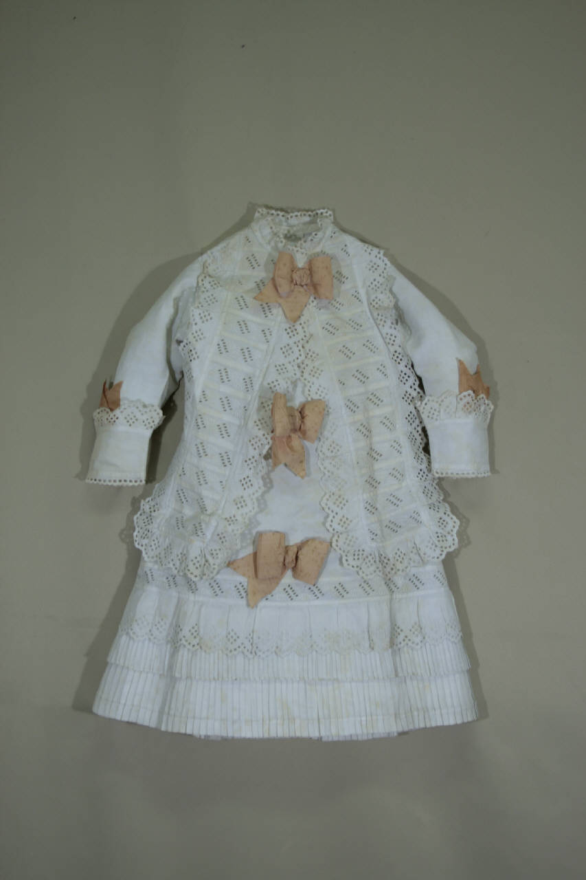 Abito in piquet di cotone bianco, con collo a ruche in Sangallo, impiegato anche per la coppia di gale disposte sull'abito, in senso diagonale, che celano l'abbottonatura definita da 9 bottoncini rivestiti in cotone (chiusi da asole) e due bottoni in madreperla (chiusi da occhielli); orlo rifinito da una balza in sangallo e duein tela di cotone plissettato. Maniche lunghe dritte con alto polsino rifinito da un merletto Sangallo. Sul retro fianchetti rifiniti con merletto Sangallo. Fiocchi in taffetas pesca applicati sul davanti (tre), sul retro (1) e sui polsi.