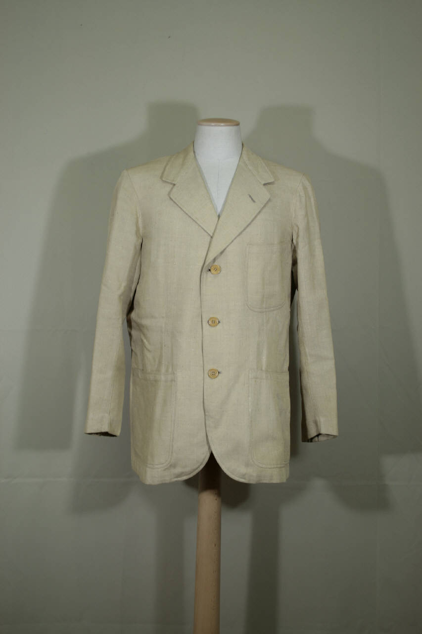 Giacca monopetto, 3 bottoni e 3 occhielli, collo con risvolti con occhiello, modellata da pinces, tre tascheapplicate; dorso con sprone, doppio soffietto e martingala cucita, cucitura centrale con spacco all'orlo. Maniche in due pezzi con spacco sulla manica con 2 bottoni e altrettanti occhielli. Fodera in taffetas tortora parziale, essendo presente sul petto e sul dorso. Tasca interno con filetto e patta (entro cui è l'etichetta) e spalle imbottite. E' confezionata in taffetas di seta molto irregolare beige.